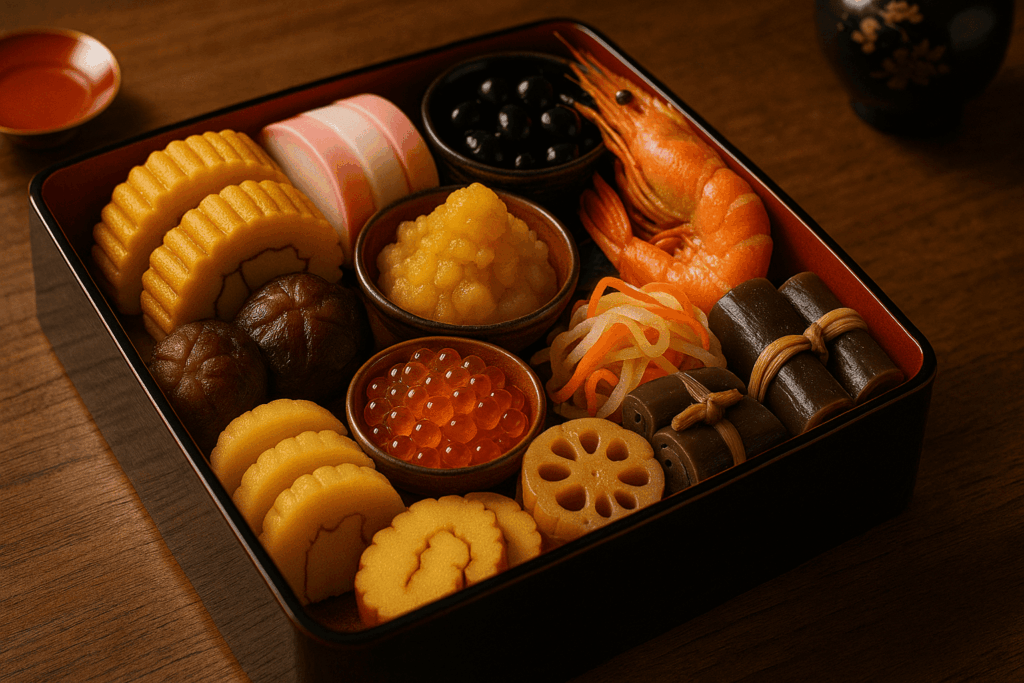 Shogatsu is also famous for Osechi Ryori, a special meal prepared in advance and packed in beautiful lacquer boxes. Each dish has a symbolic meaning: