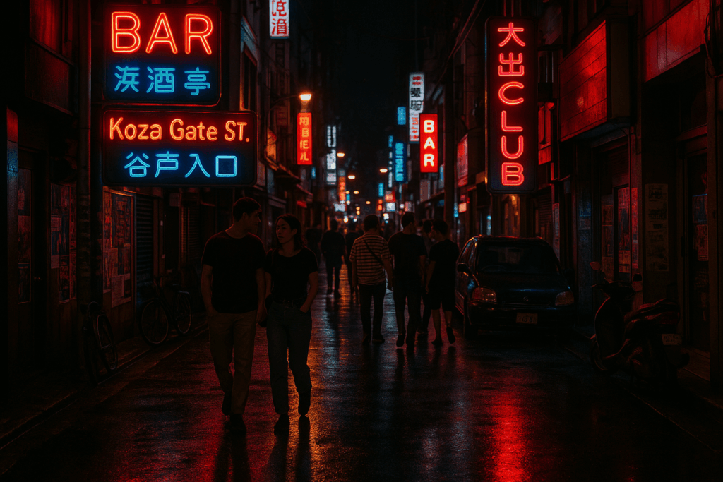 Right outside one of Kadena Air Base’s gates, Koza Gate Street and the nearby BC Street / Park Avenue form Okinawa City’s most famous entertainment zone. Neon signs in English, vintage bars, live music clubs, thrift shops, tattoo studios, burger joints, taco shops—it all feels half Okinawa, half small-town America. This is also one of the main stages for Eisa performances during festivals and street events.