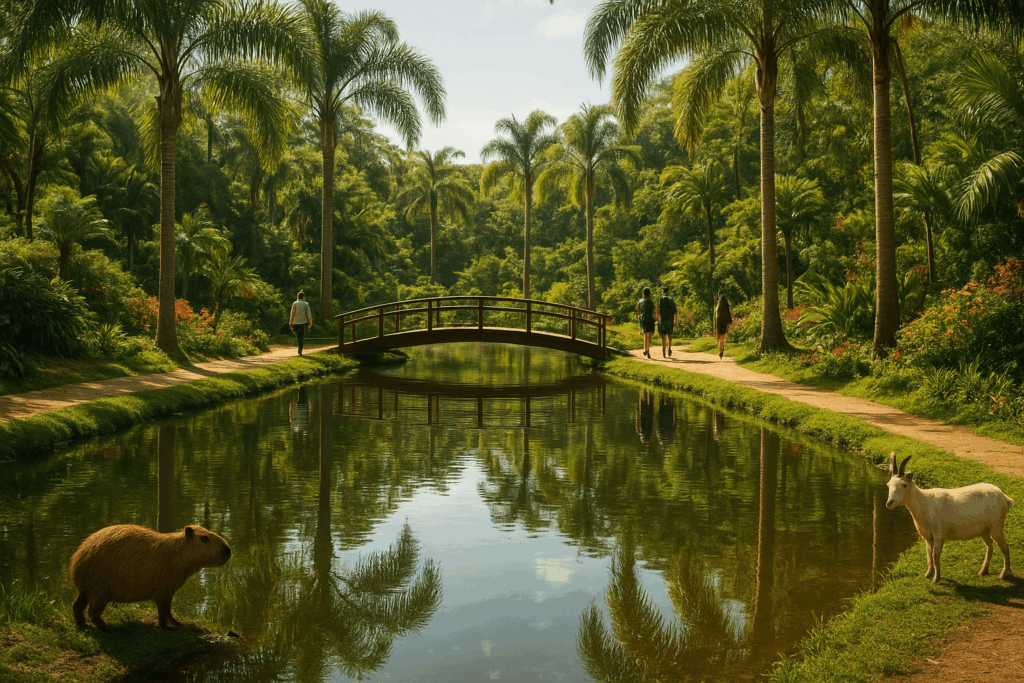 Southeast Botanical Gardens is a large botanical and animal park on the outskirts of Okinawa City, with palm-lined ponds, flower gardens, rare plants (including dragon blood trees), and interactive animal areas such as petting zones, capybaras, goats, and bird shows. At night, seasonal illumination events turn the gardens into a light-up wonderland.