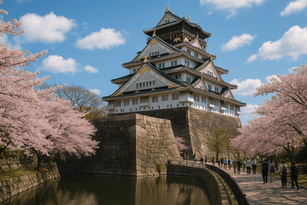 This magnificent fortress stands as one of Japan's most famous landmarks, originally built in 1583 by the legendary samurai warlord Toyotomi Hideyoshi. The impressive five-story main tower rises majestically above massive stone walls and wide moats, surrounded by expansive park grounds featuring over 600 cherry trees that create spectacular pink canopies during spring. The castle museum inside houses samurai armor, historical artifacts, detailed exhibits about feudal Japan, and an observation deck offering panoramic views of modern Osaka's sprawling cityscape.